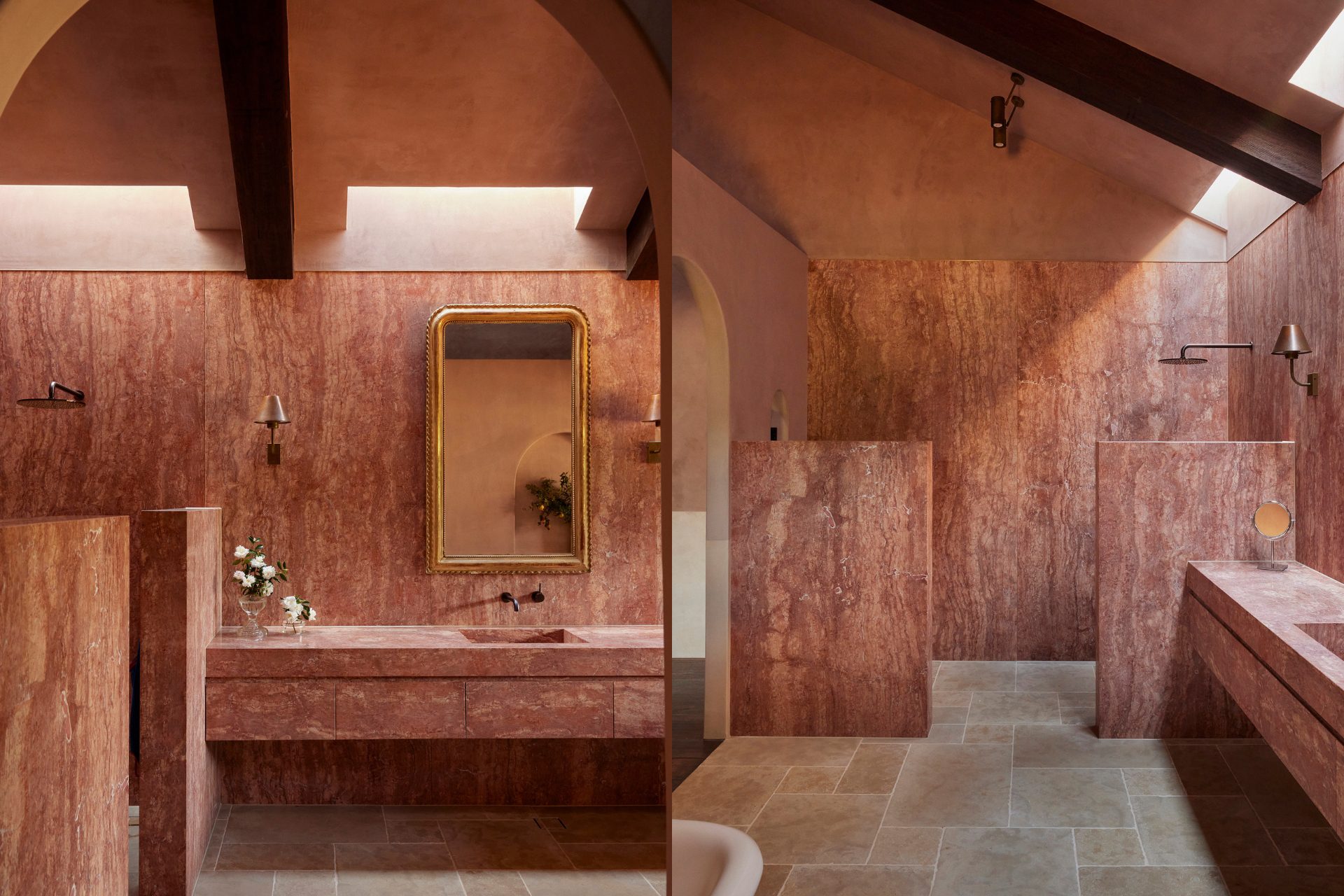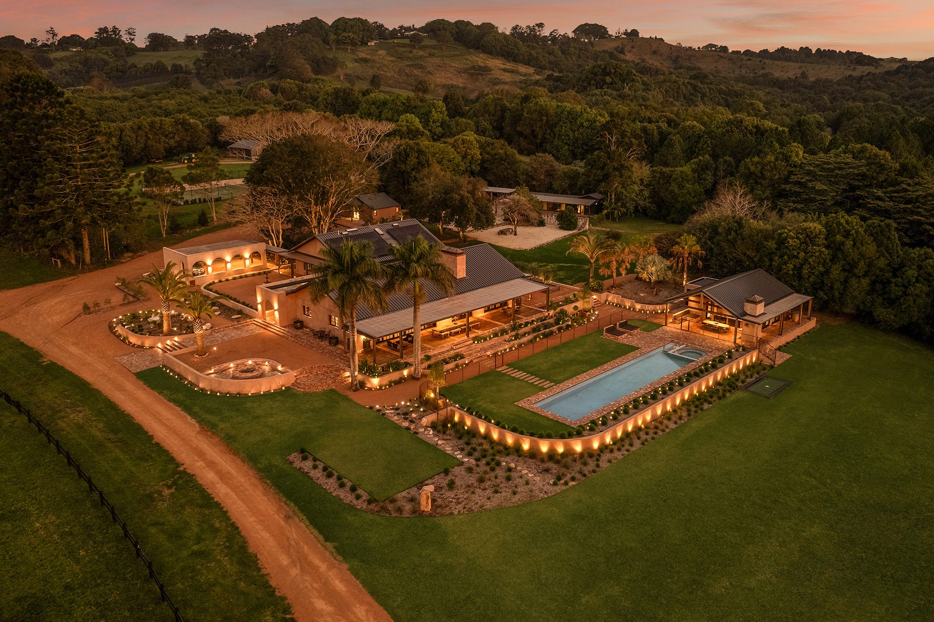 Homestead: Set upon the peak of the estate to capitalise upon incredible year-round sunsets, and breathtaking views of green pastures, the homestead features 5 bedrooms (master with fireplace), each with king bed, ensuite (with floor heating), walk-in-robe and private deck. Providing a world-class dining experience, a huge open plan kitchen (complete with state-of-the-art appliances and wood-fire oven), butler’s pantry, cold room, walk in pantry, bar, and dining room is further extended by outside dining and seating areas on the front deck. Featuring an enormous fireplace and built-in Italian velvet sunken lounge, with high vault ceilings and Vox Populi Chandelier, the living room provides an elegant and inviting entertaining area. With separate media room, library, laundry, powder room and boot room, the floor plan is complete. Effortlessly matching modern design with the use of organic and recycled materials such as Darwin stringy bark timber and pink travertine, tone and texture play a key role in creating a refined interior, one filled with a genuine sense of calm and timeless charm.
