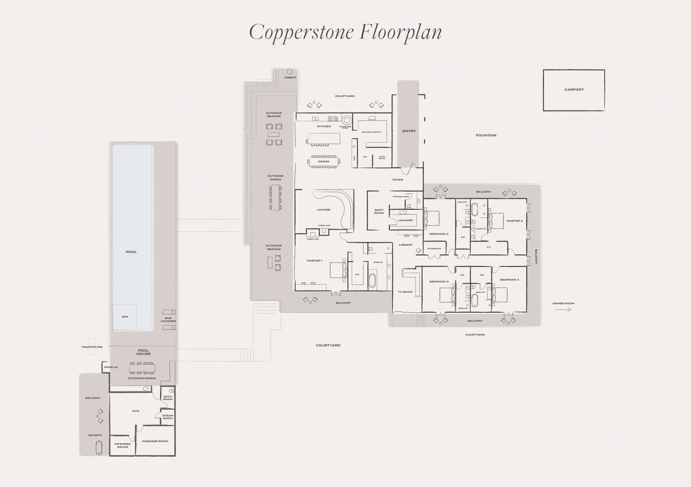 Pool House: With views over Copperstone’s gardens and pastures, the pool house offers endless opportunity to relax, unwind, and become connected to the natural world that engulfs the estate. Featuring a 25m mineral swimming pool and spa, various lounge areas, alfresco entertaining area, Argentinian parrilla and outside fireplace, the space fully optimises every hour of daylight, making it the perfect place to enjoy afternoon cocktails or an evening dinner poolside.