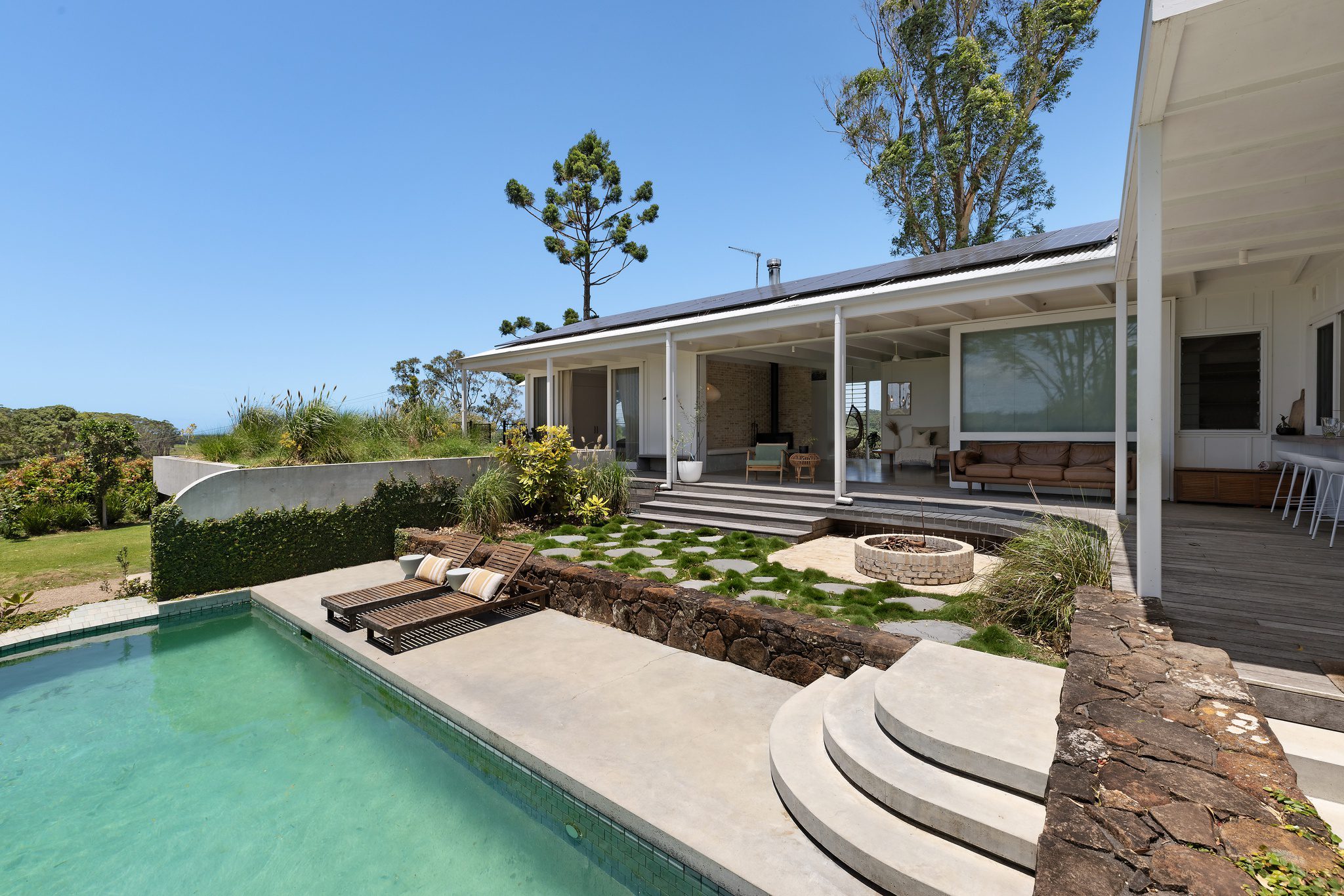 The north-facing living area is bathed in natural light. Its polished concrete floors, handcrafted lounge, and dual-glass wood fire create a warm, sophisticated vibe. A feature wall leads to the tranquil master suite, which includes a double ensuite, a freestanding stone bath, and a unique brick fireplace.