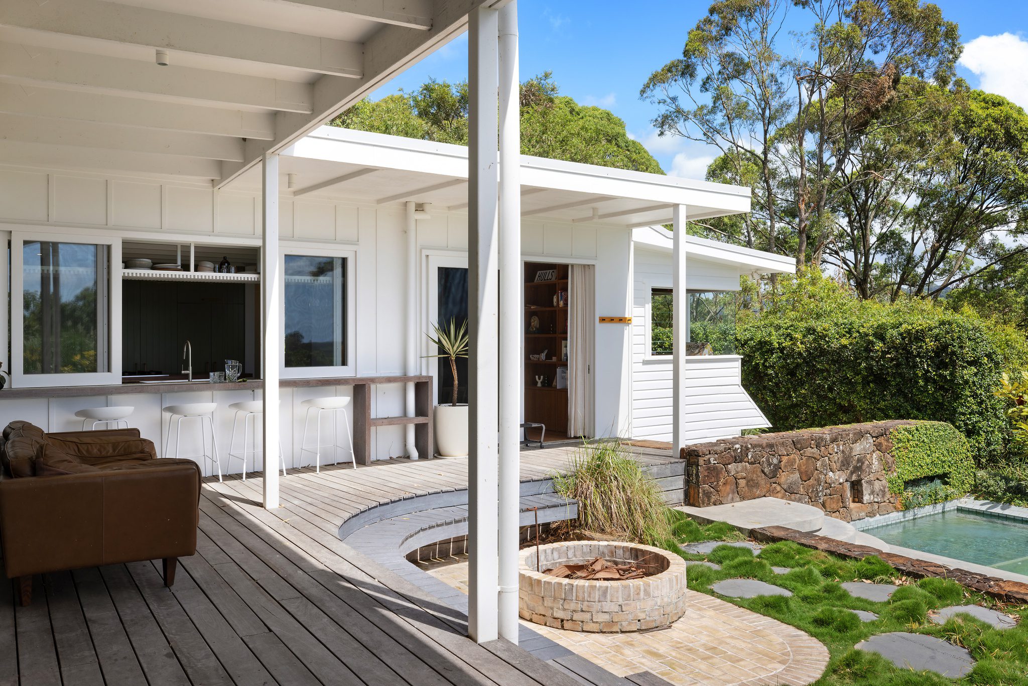 Inside, you’ll find four bedrooms, a study, two bathrooms, a dedicated office, and a designer kitchen with premium European appliances. Inspired by the surrounding sugarcane fields, the olive-green kitchen features a locally sourced timber countertop that extends to a bay window, seamlessly connecting to the outdoor dining and pool area.