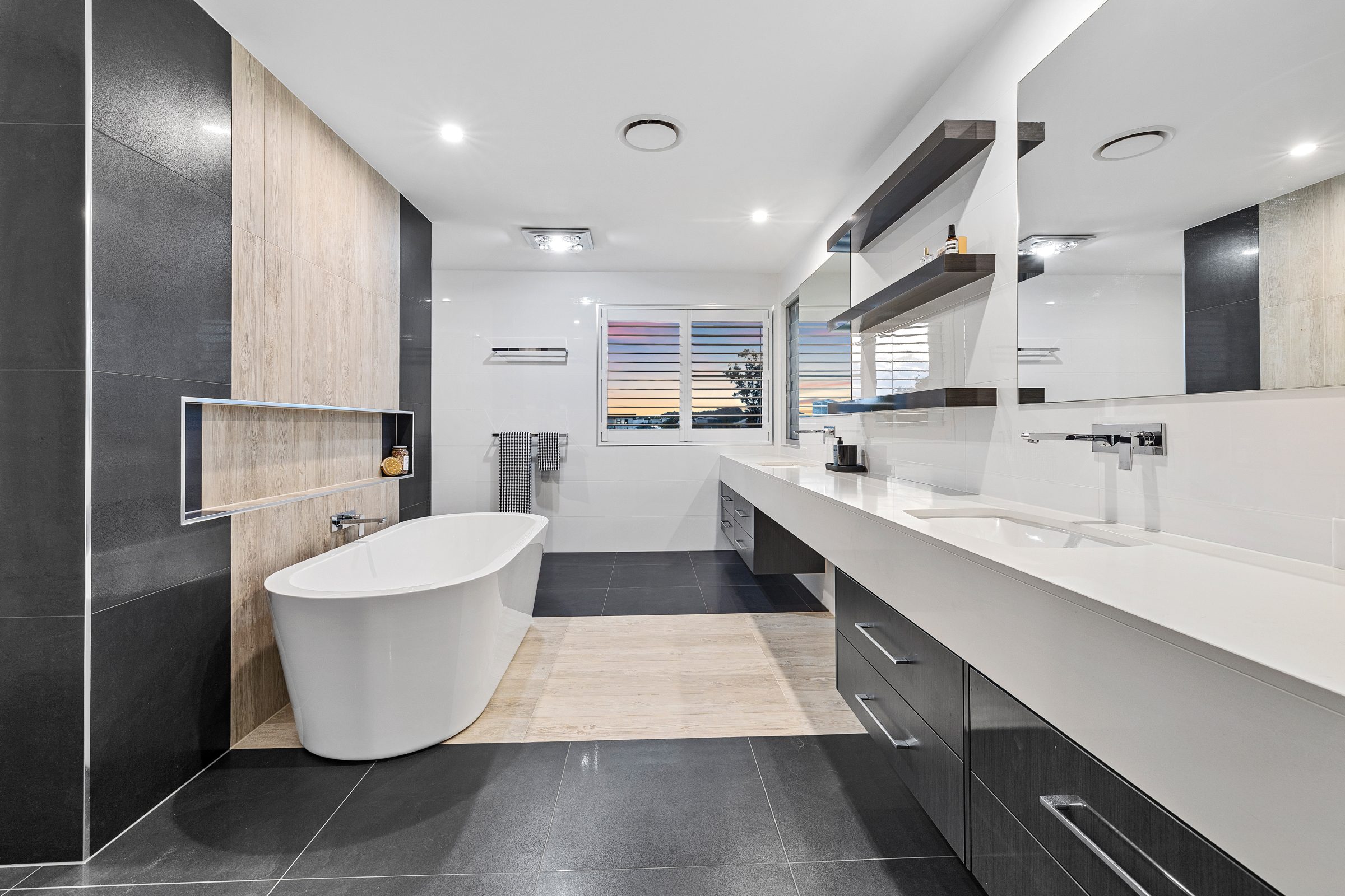 The upscale elegance continues upstairs to the master bedroom and 4 additional ensuited bedrooms, all with spacious walk-in robes. Mention must be made of the tranquil master bedroom & private balcony, overlooking the dunal greenspace of Kingscliff Beach. Sheer curtains billow in the breeze, creating a quiet ambience for you to relax in & enjoy some down time. The huge walk-through double robes have discreet timber cabinetry & glass display sections to store your favourite jewellery. You will also love the privacy & opulence of your enormous ensuite, as you soak away the day’s stresses in your free-standing bath. All 6 sleek bathrooms have floor to ceiling tiling & quality custom-built cabinetry.