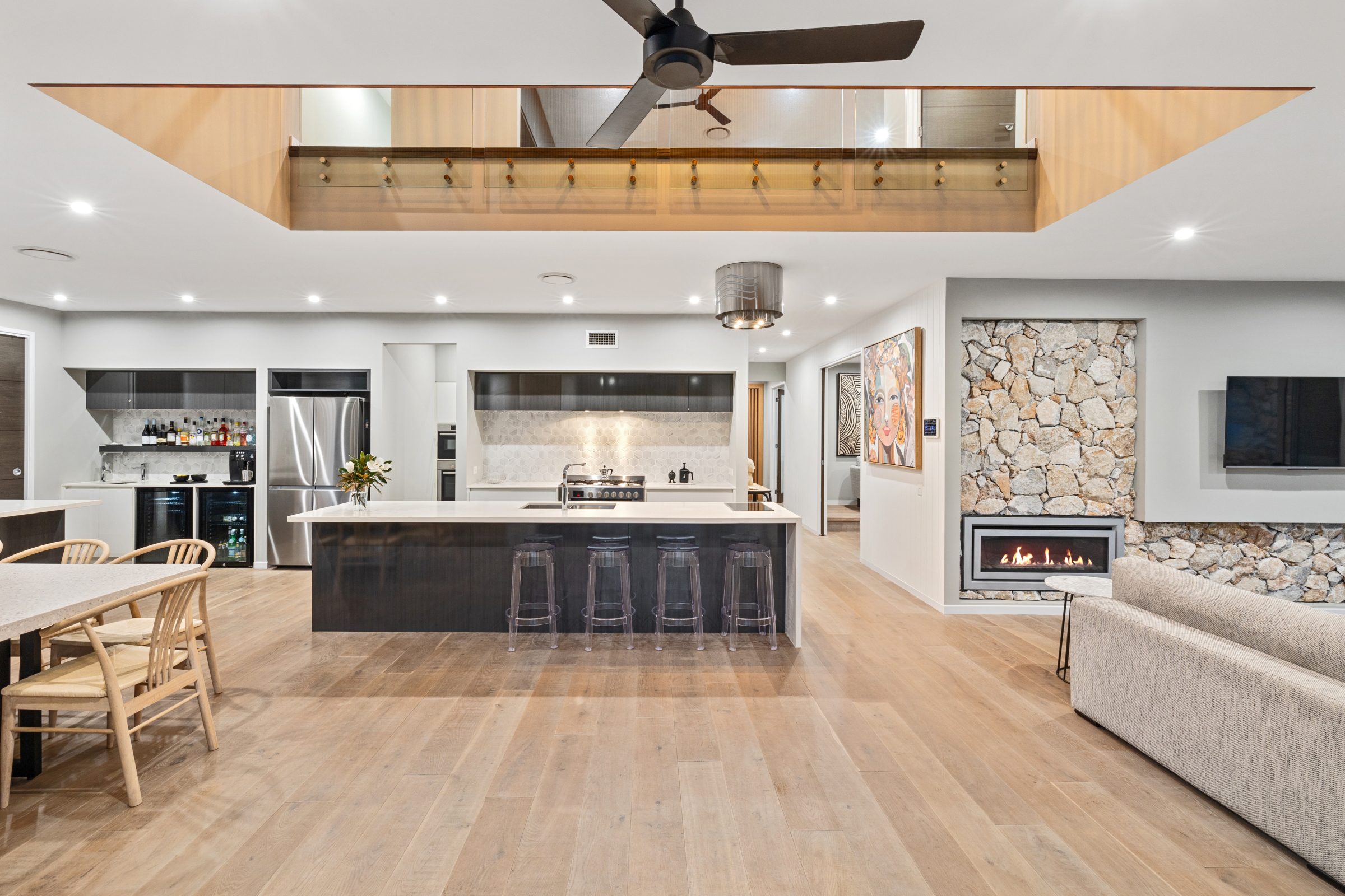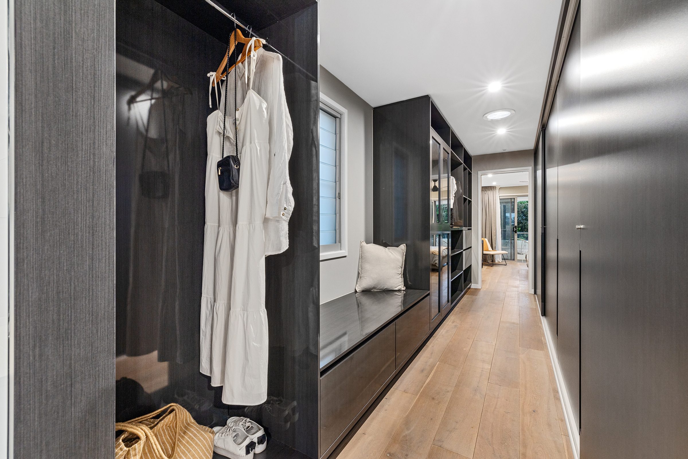 Central to the living space is the stunning kitchen with a 900 wide gas cooktop, additional 2 plate induction cooktop, custom built soft close cabinetry, zip tap & coffee station. The Caesar stone island bench, 2 wine fridges, double dish drawers & double ovens make entertaining a joy. A handy butler’s pantry with copious pull-out storage drawers & shelving highlights some of the many inclusions to this outstanding kitchen.