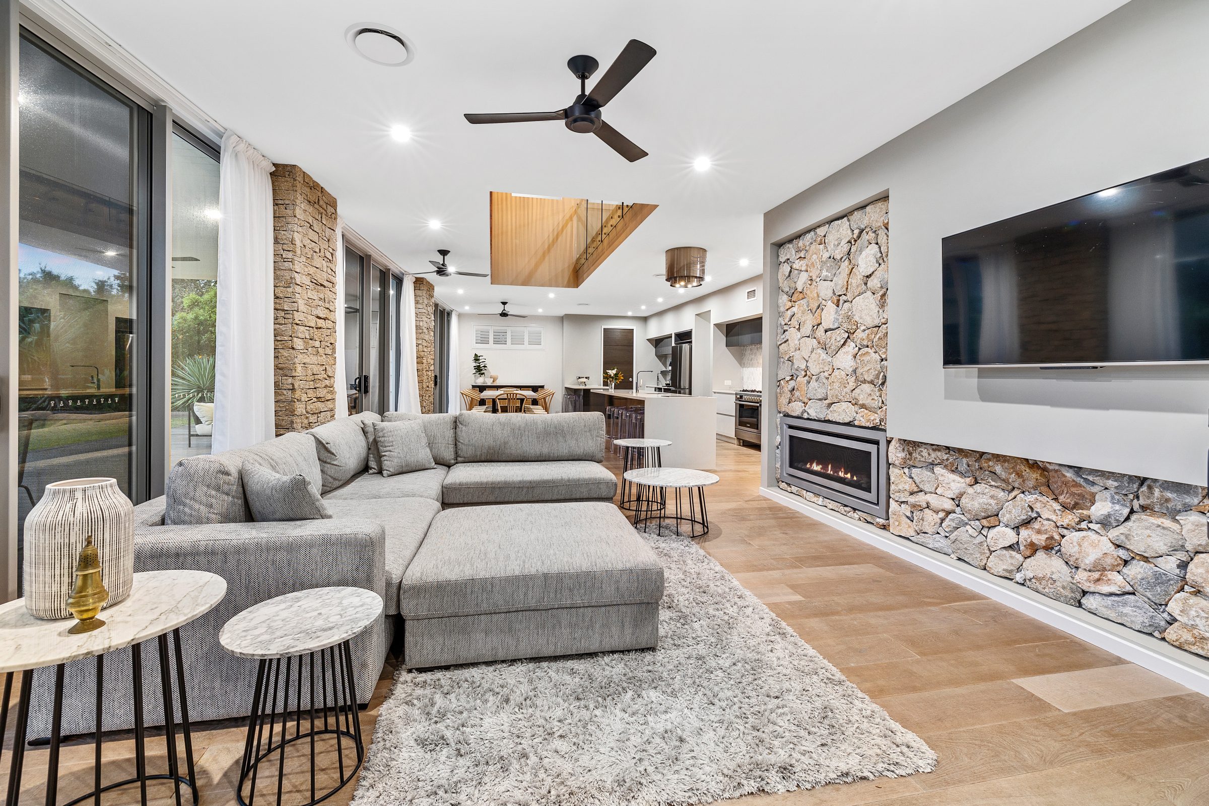 The striking street facade artistically encased in gorgeous natural stonework creates instant external appeal. A genuine blackbutt timber, pivot front door is custom designed & welcomes you into ”THE KINGSCLIFF RETREAT”. This is a very private sanctuary where your whole family & guests can relax, breathe & enjoy!!!